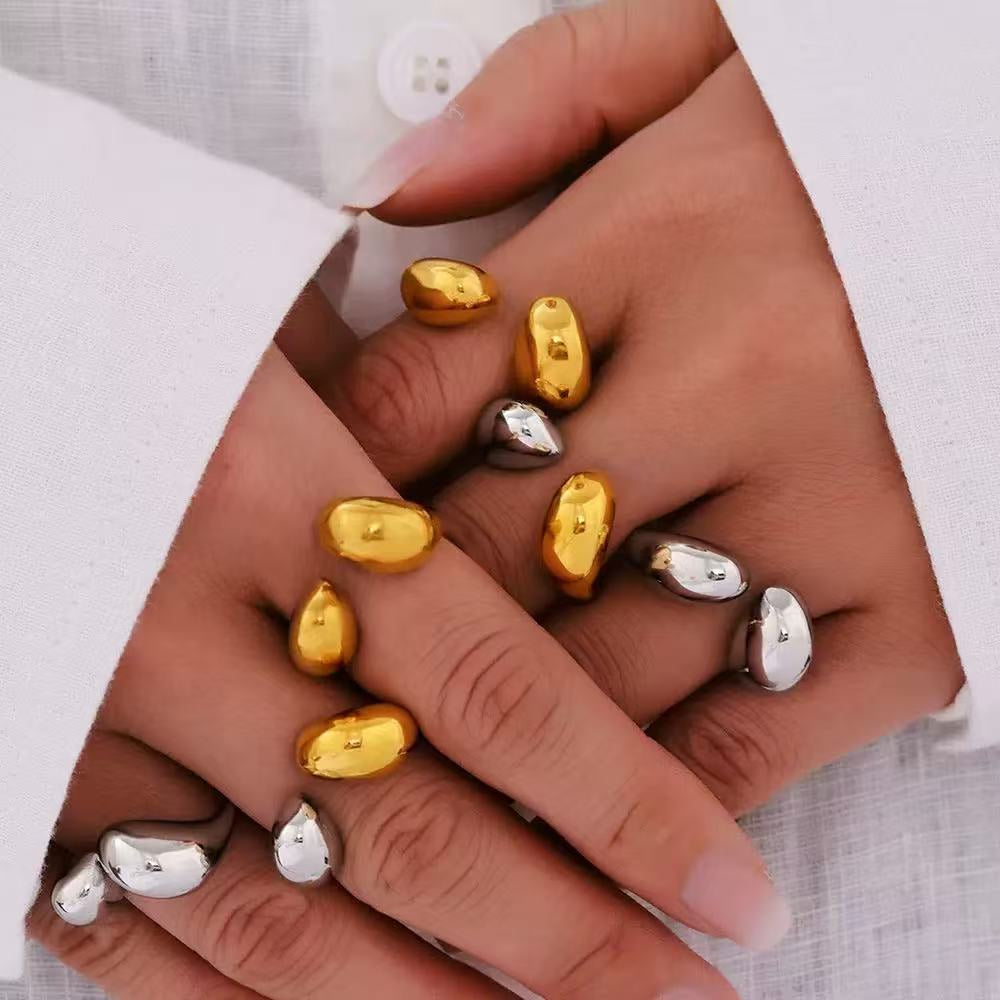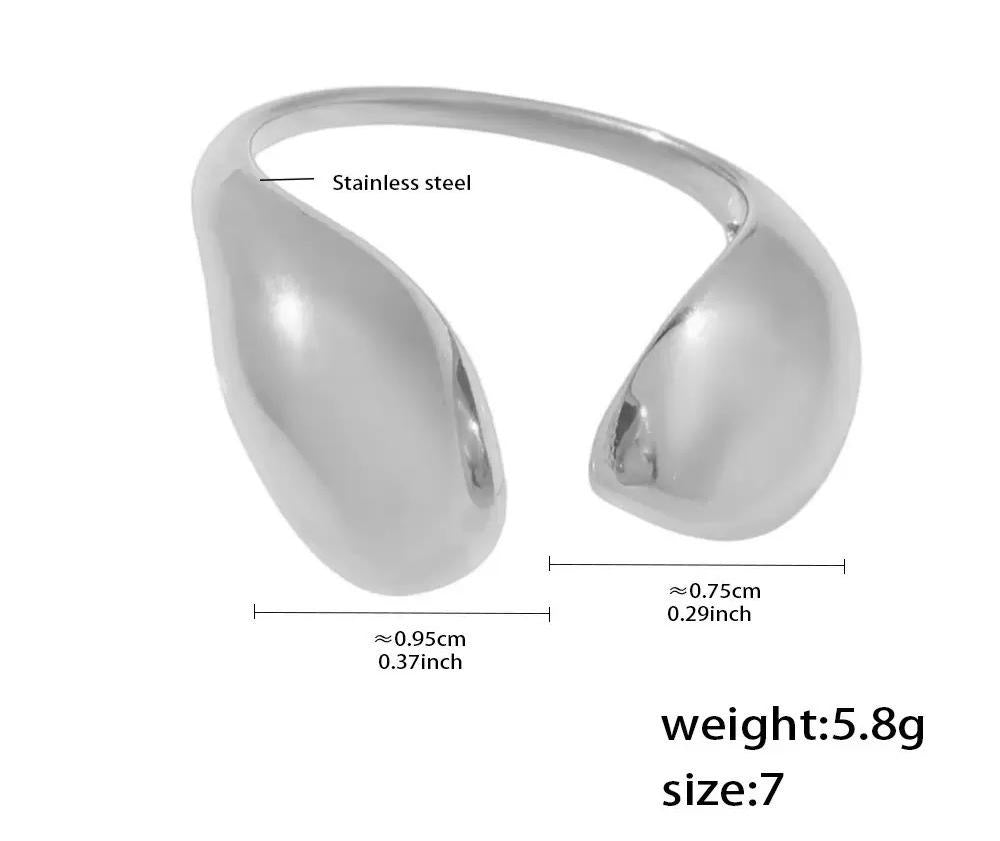 Es un anillo ajustable , queda por la parte fron tal con una apertura simulando dos gotas de metal en cada lado del dedo