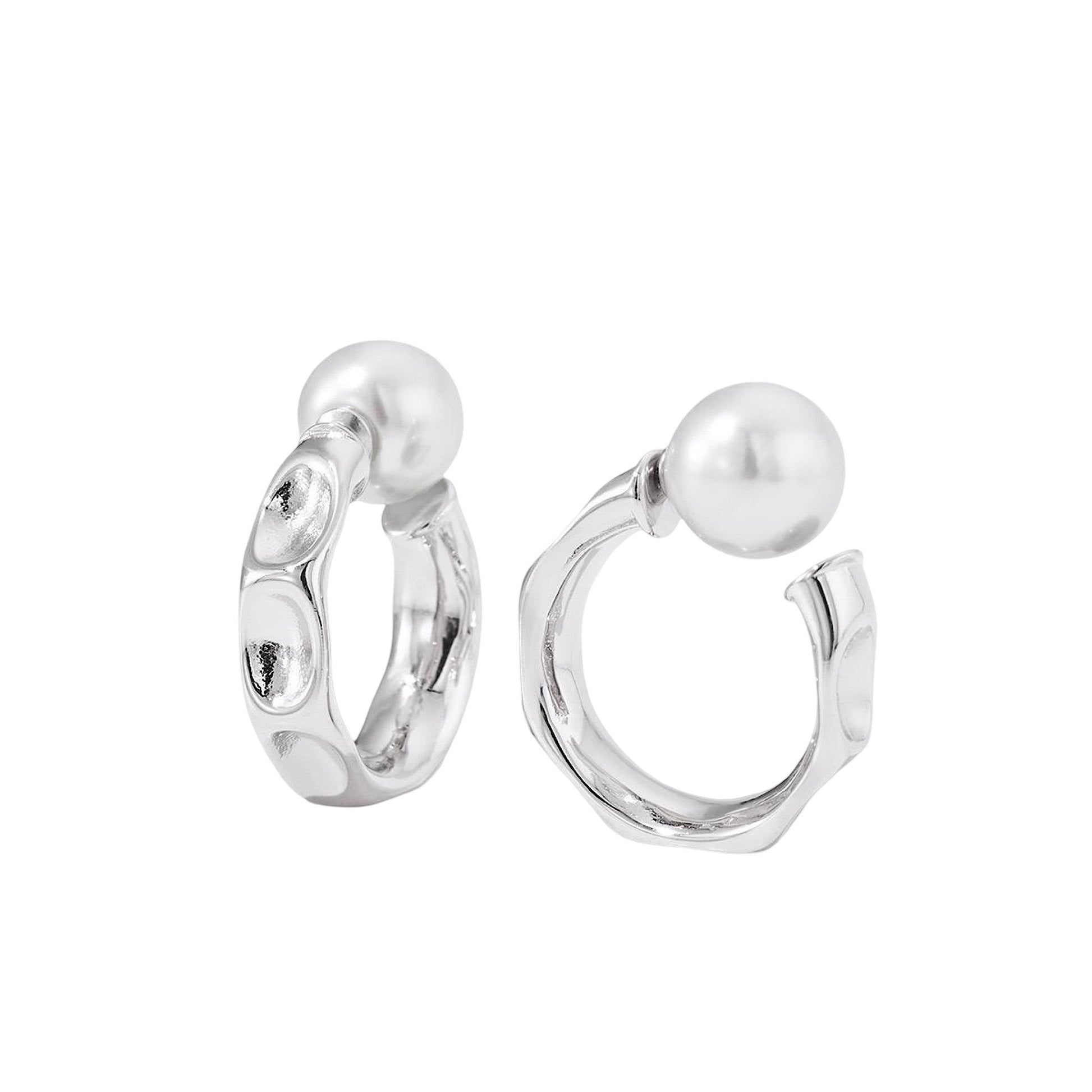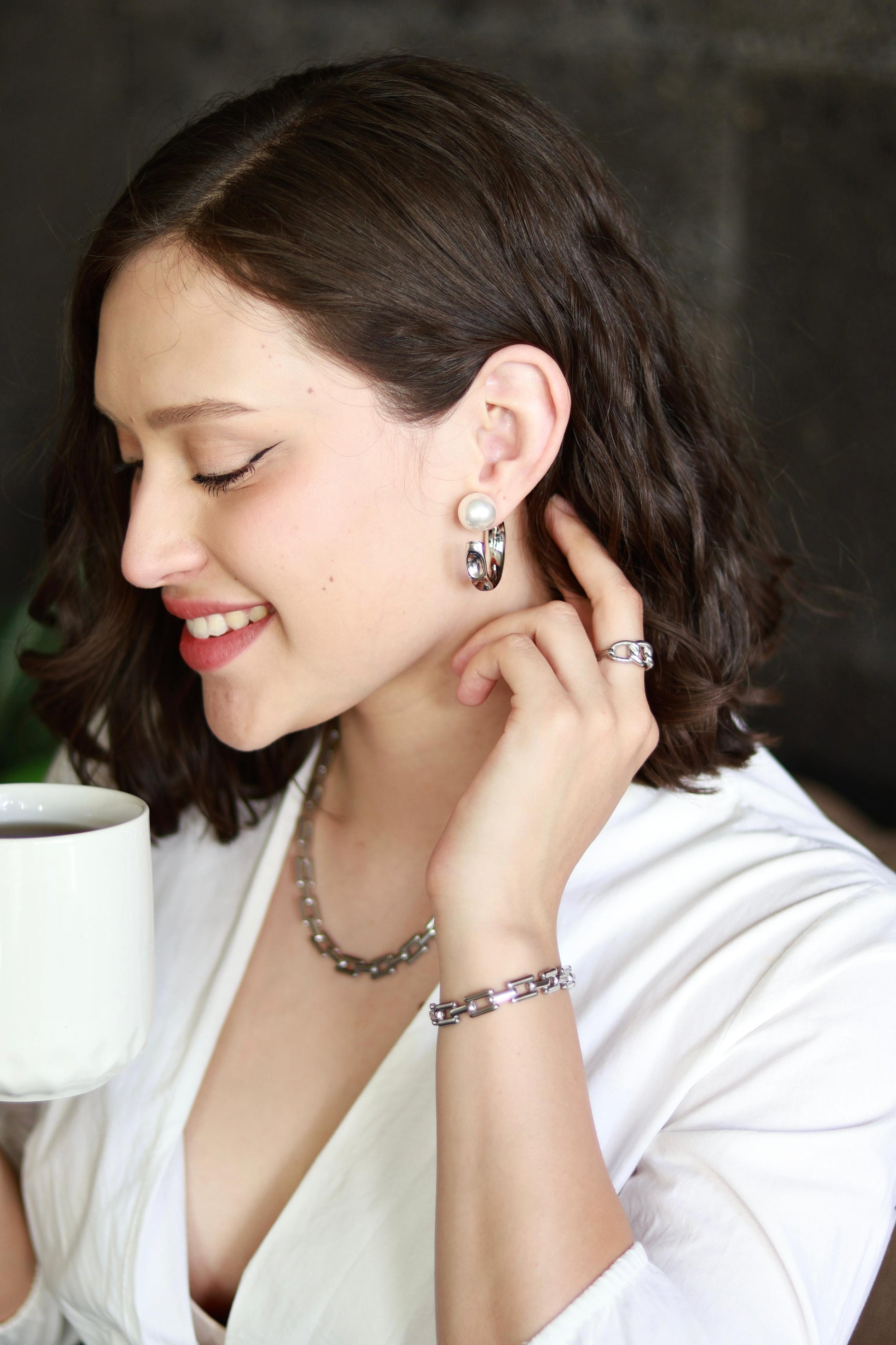 Aretes hoop de acero titanio bañado con rodio y en el broche tiene una Perla , la puedes poner por la parte de enfrente o por la parte de atrás , incluso sustituirla por para palomita y tendrá un estilo diferente