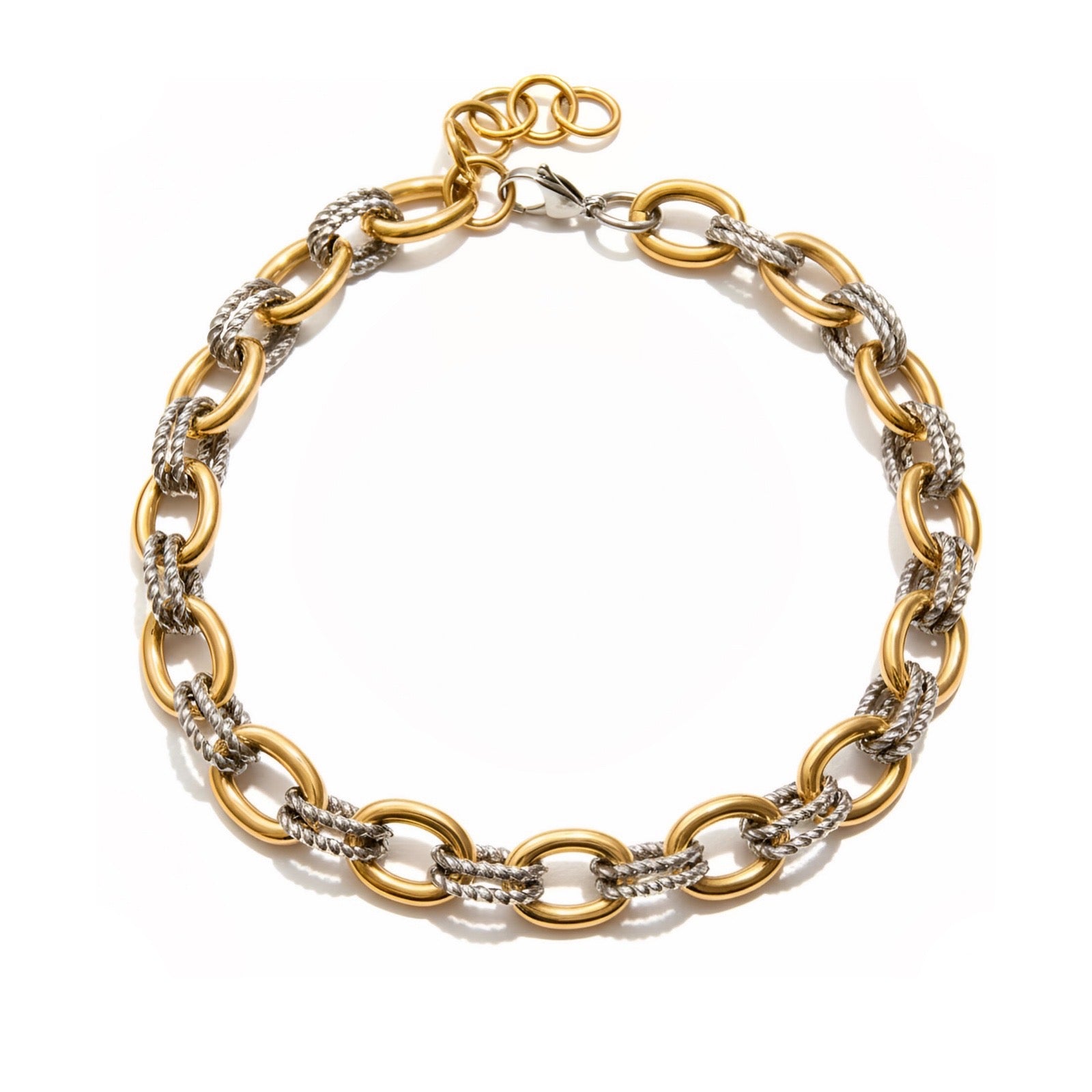 Es una cadena de eslabones gruesos, dorados y con forma ovalada, unidos por dos eslabones plateados, ovalados en forma de torzal. Forman una cadena gruesa y preciosa, dando apariencia de qué con eso es suficiente por eso su nombre Enough!! Recordándote que tú sola, ya eres suficiente