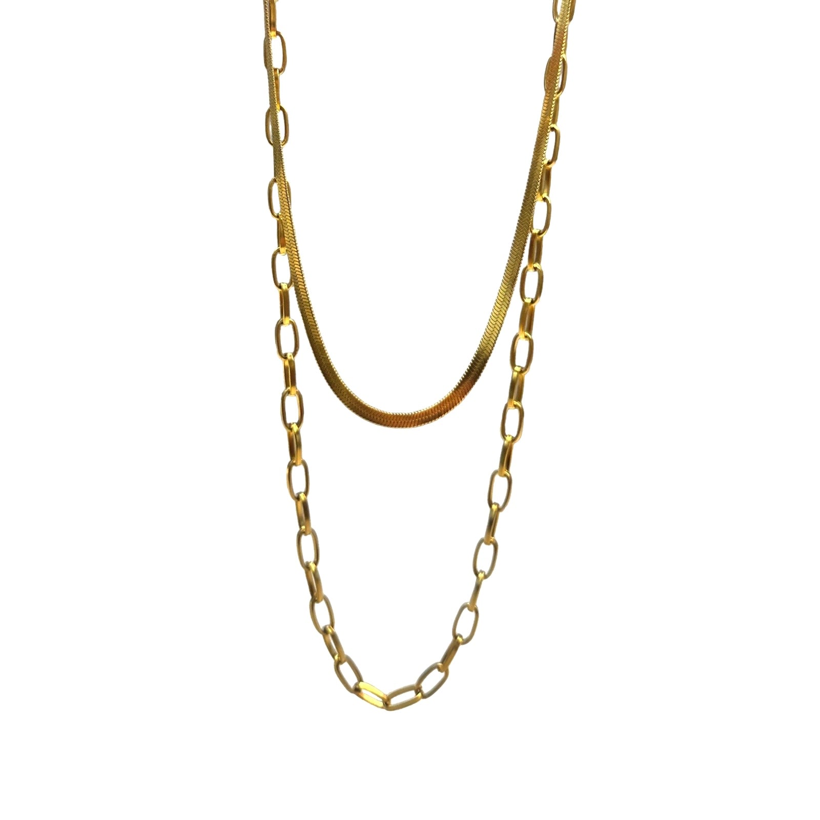 Es un collar conformado por dos cadenas la primera es planchada delgada de aprox 40 cm de longitud, seguido de una cadena más larga de aprox 53 cm con eslabones alargados delgados