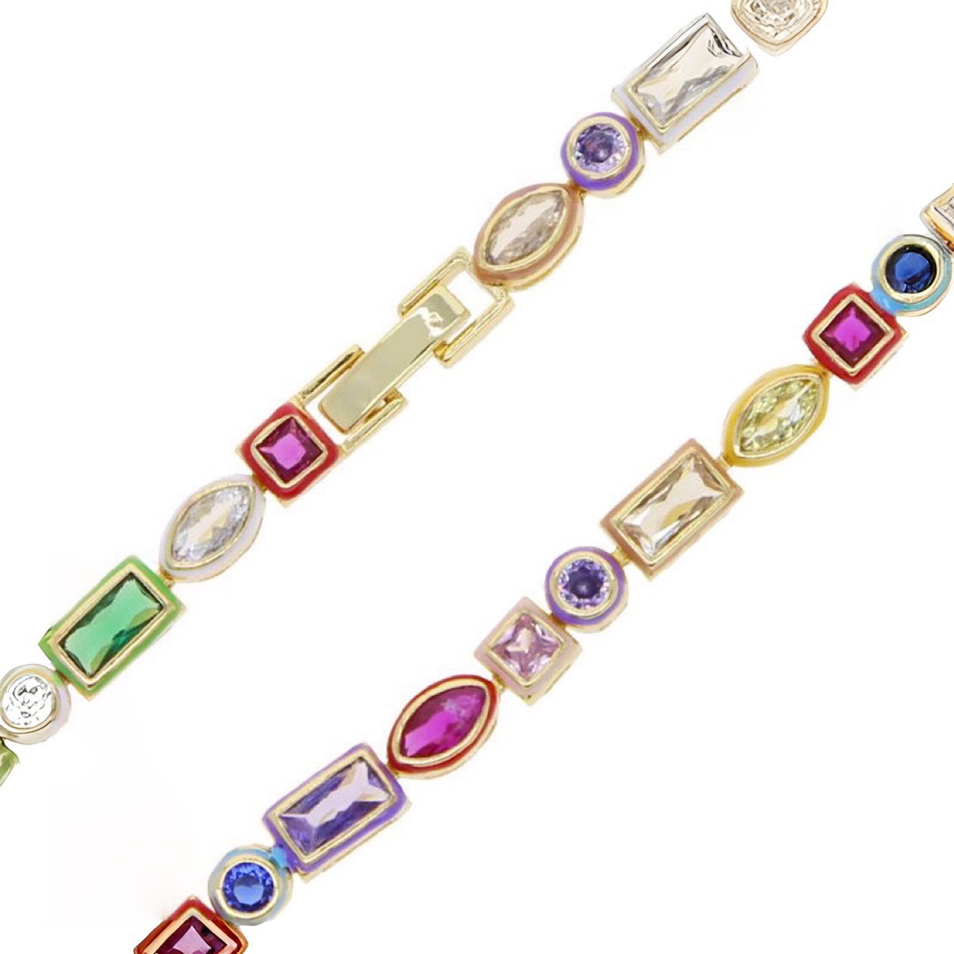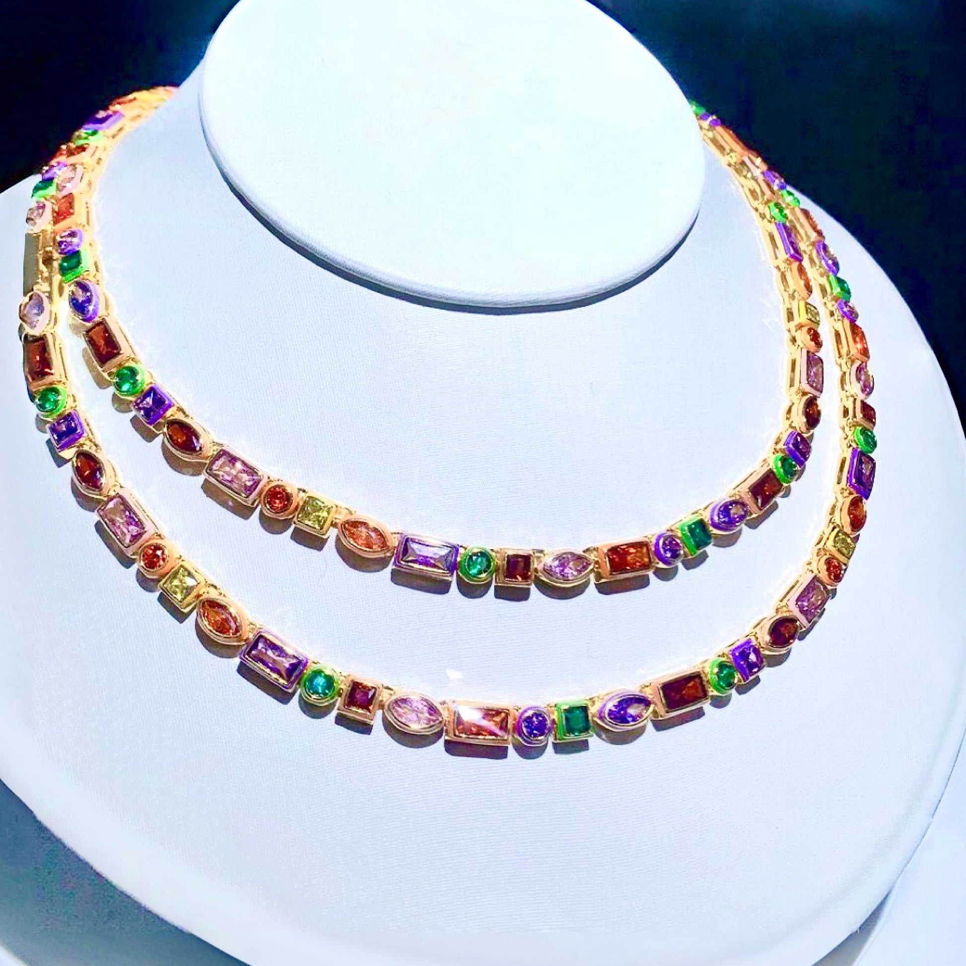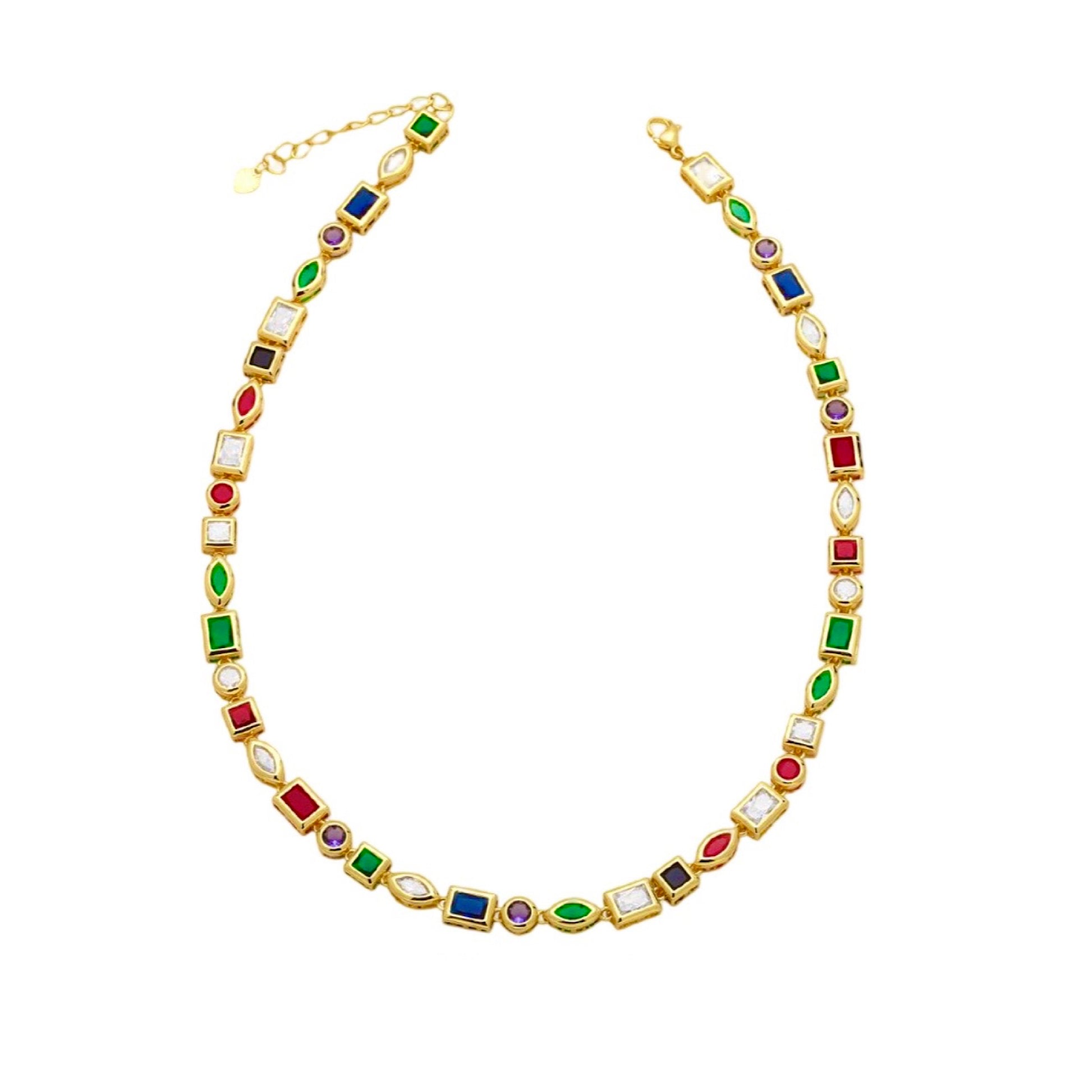 Es una gargantilla hermosa , con cristales de calidad triple A montados en piezas esmaltadas con colores y la base es oro laminado con 7 baños de 18k