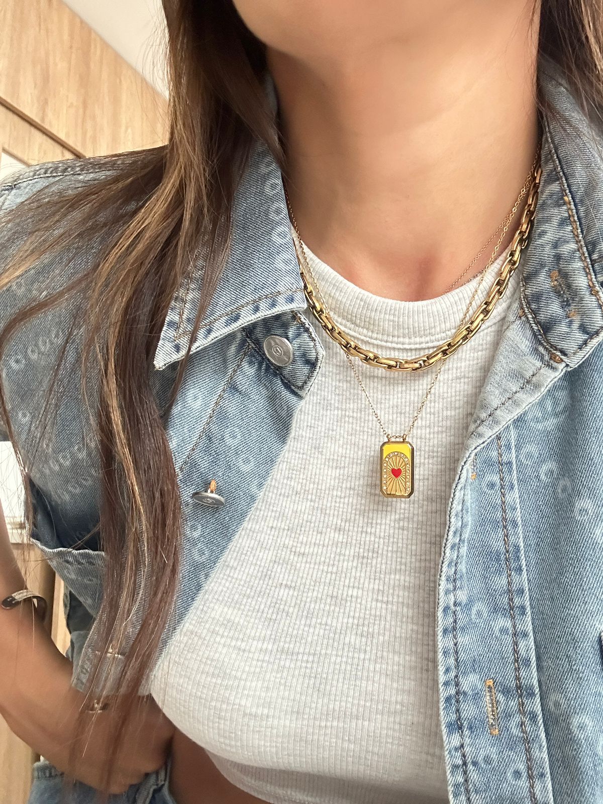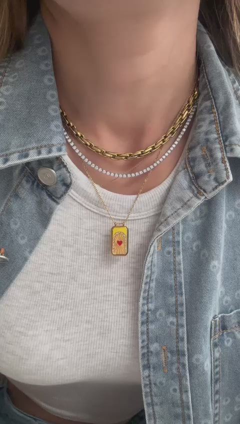 Cadena delicada y elegante de acero titanio, con un tejido único en forma de víbora cilíndrico que aporta versatilidad y estilo. Destaca por un hermoso charm colgante en forma de corazón rojo esmaltado, rodeado por destellos de luz y pequeños cristales que capturan todas las miradas. Una pieza delicada y llamativa a la vez, resistente al agua, perfecta para lucir en cualquier ocasión e ideal para combinar en layering.