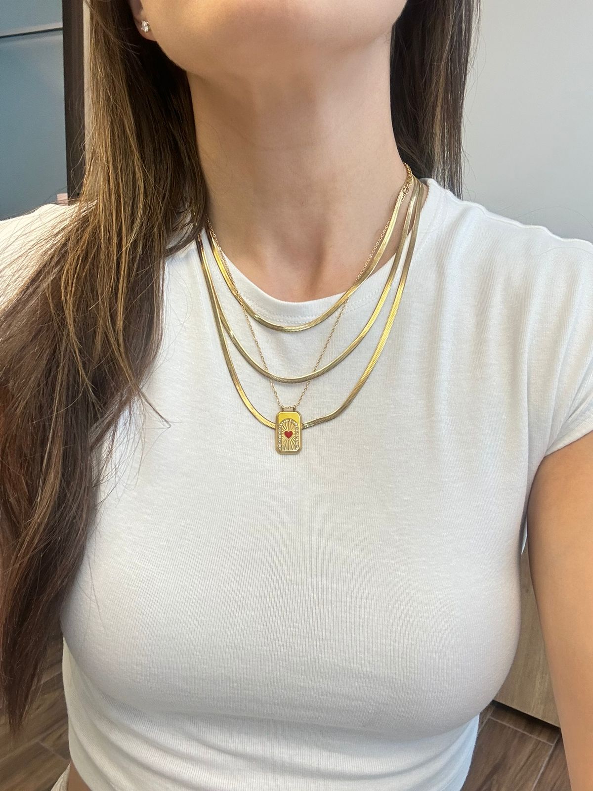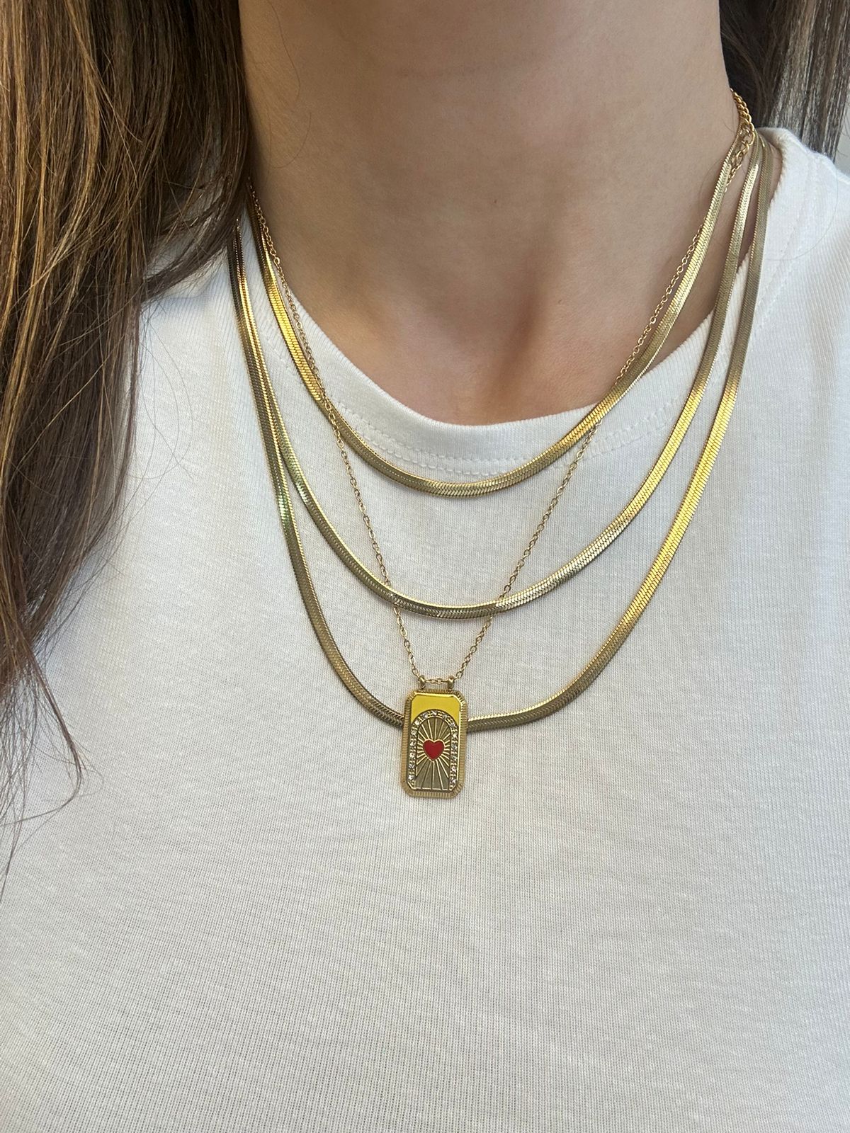 Cadena delgada y elegante de acero titanio con baño de oro laminado de 18k. Presenta un charm colgante en forma de corazón rojo esmaltado, adornado con cristales radiantes que reflejan destellos de luz. Su diseño triple planchado aporta resistencia y sofisticación, logrando un equilibrio perfecto entre lo delicado y lo llamativo. Además, es resistente al agua, lo que la convierte en la joya ideal para usar diariamente sin perder su brillo.