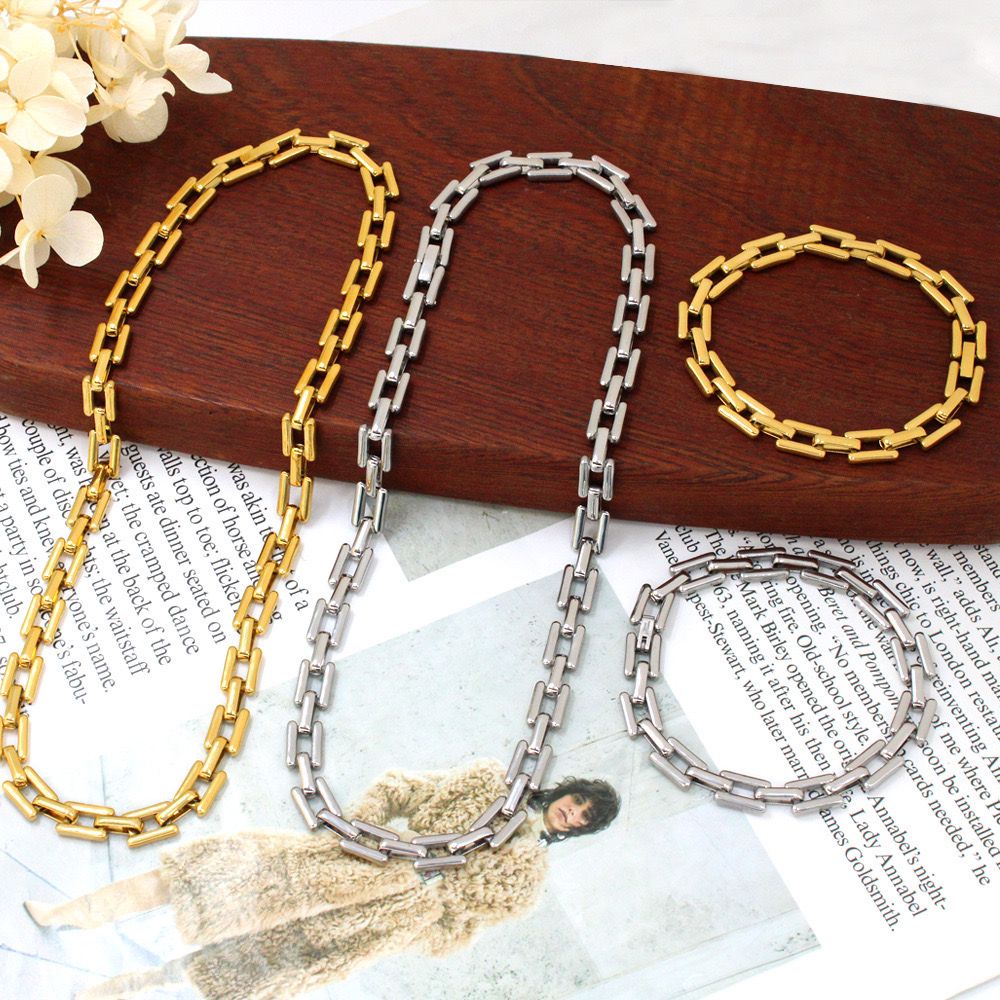 Pulsera de cuadros acero titanio con baño de oro de 18k resistente al agua , el collar también está disponible en la página