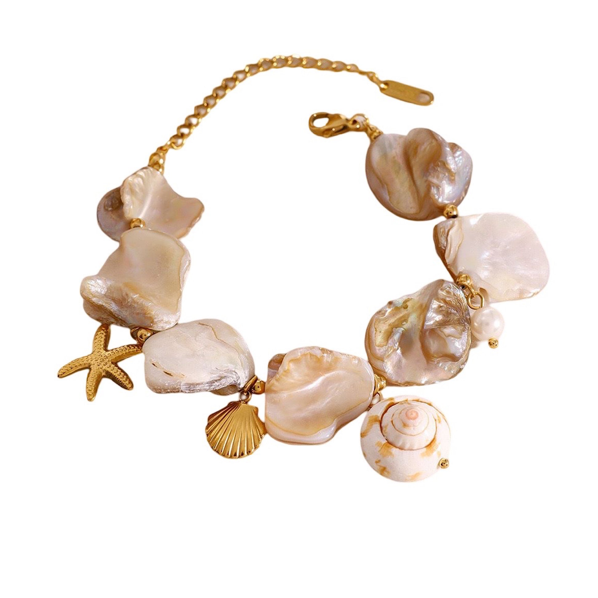 Es una pulsera de concha natural con charms de acero titanio y concha , súper padre y resistente al agua